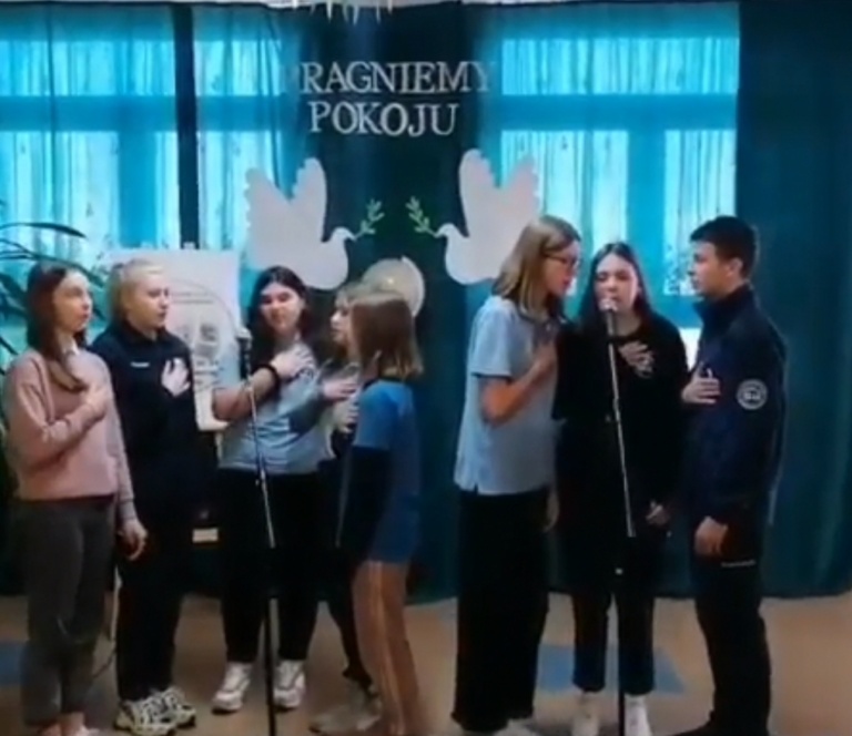 Dziś podczas szkolnego kiermaszu dobrych serc wydarzyło się coś przepięknego i ogromnie wzruszającego… Ania, Dasza, Yewa, Tetiana i Karina – Uczennice z Ukrainy spontanicznie zaśpiewały…