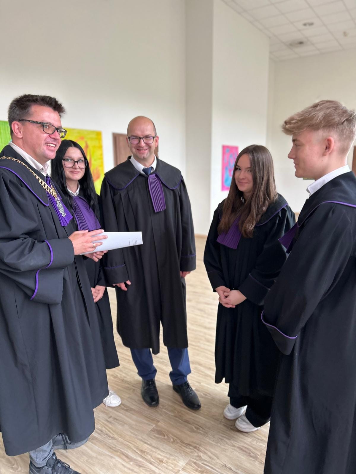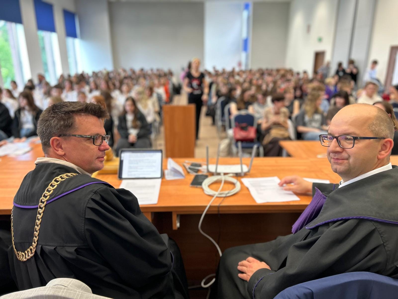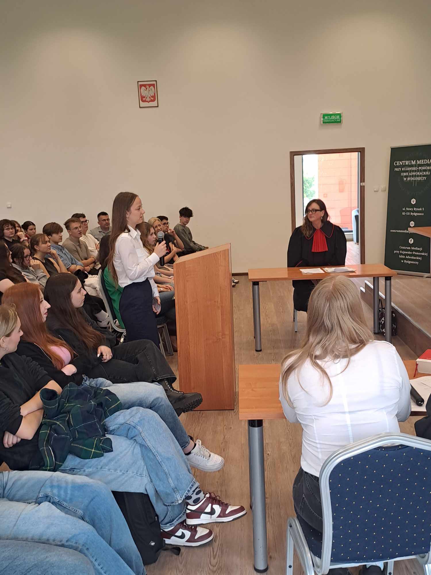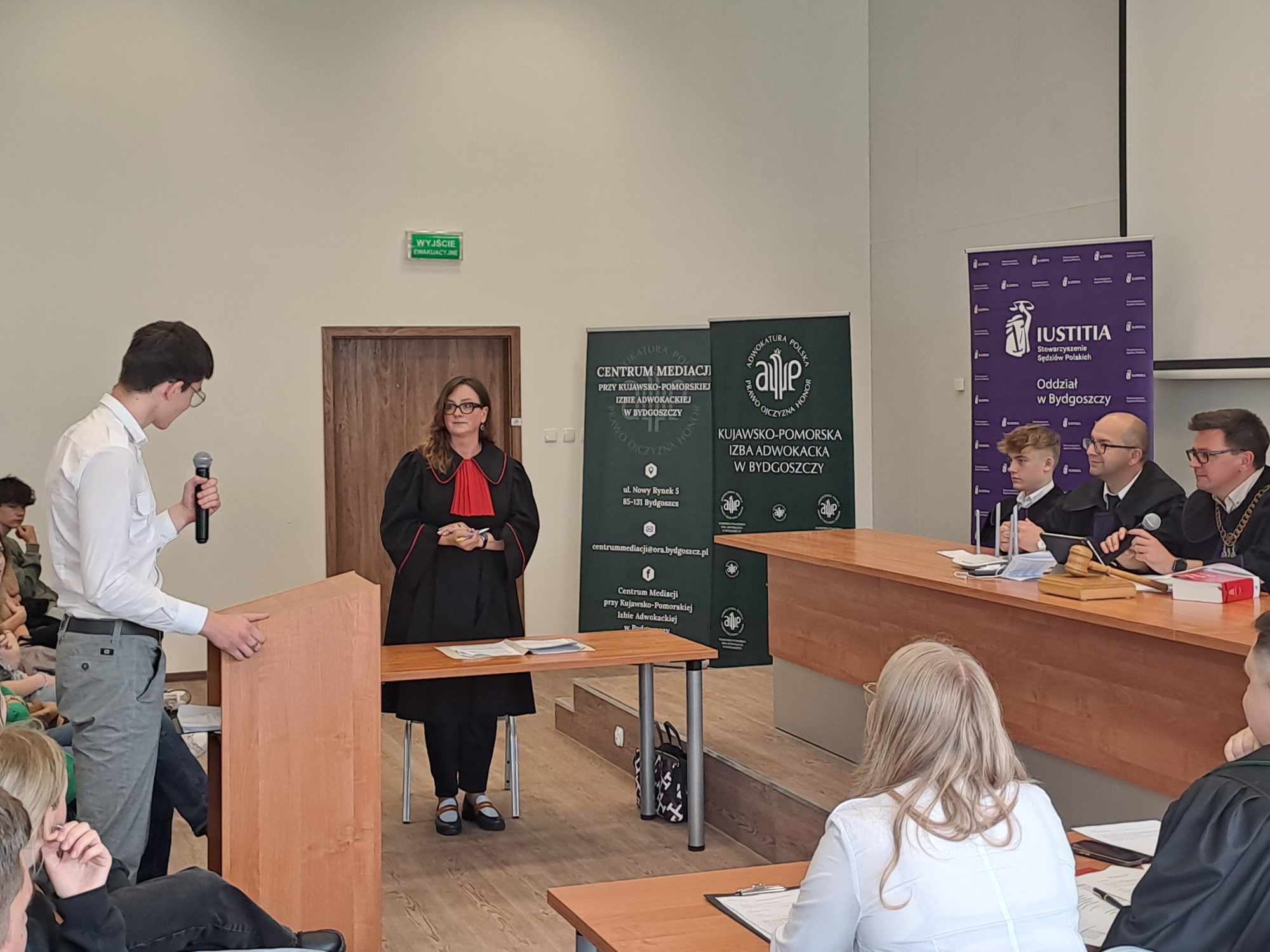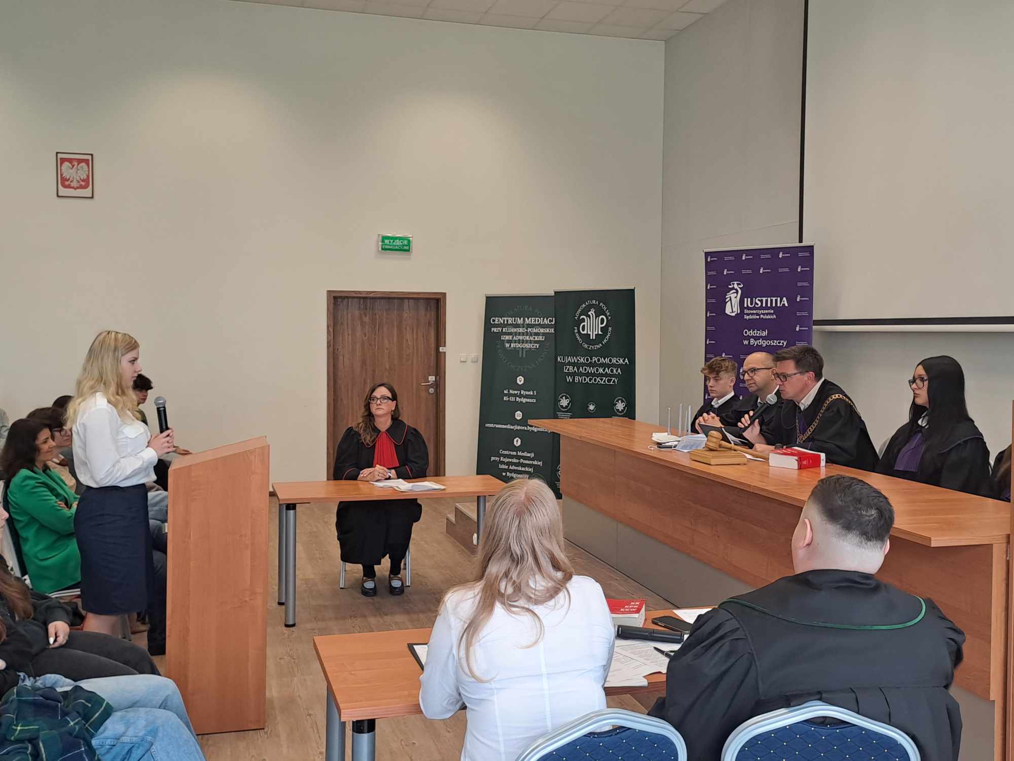 23 maja przypada Międzynarodowy Dzień Sprawiedliwości upamiętniający śmierć włoskiego sędziego Giovanniego Falcone, który zginął w zamachu przygotowanym przez sycylijską mafię. Formą uczczenia tego dnia jest fioletowa wstążka wpinana do stroju przez sędziów oraz przedstawicieli zawodów prawniczych.     Z tej okazji – w ramach ogólnopolskiego Festiwalu Rozpraw odbyła się „Rozprawa na Bielawach. Proces Lady Makbet” zorganizowana przez bydgoski Oddział Stowarzyszenia Sędziów Polskich Iustitia i Fundację Edukacji Prawnej Iustitia, Uniwersytet Kazimierza Wielkiego, Stowarzyszenie Prokuratorów Lex Super Omnia, Okręgową Radę Adwokacką i Zrzeszenie Prawników Polskich. Zebrana w Bibliotece UKW młodzież mogła prześledzić wszystkie etapy rozprawy: przedstawienie aktu oskarżenia Lady Makbet, przesłuchania świadków i biegłego, mowy prokuratora i obrońcy oraz orzeczenie końcowe.     Dla nas – uczniów klas psychologiczno–prawnych – udział w symulacji rozprawy nie był wyłącznie odtwórczym przedstawieniem procedur sądowych ale przeżyciem aktywnej edukacji… Wcielając się w role: oskarżonej Lady Makbet, świadków, biegłego i ławników, czuliśmy się współodpowiedzialni za powodzenie przedsięwzięcia. Angażowaliśmy wyobraźnię i umiejętności aktorskie, by przedstawić fakty i oddać emocje.     Symulacja była ciekawą integracją wiedzy z zakresu języka polskiego, wiedzy o społeczeństwie oraz podstaw prawa i psychologii. Zyskaliśmy nie tylko wiedzę dotyczącą przebiegu procesu karnego ale przede wszystkim możliwość kształcenia umiejętności publicznych wystąpień, argumentowania i wnioskowania. To dla nas niebanalna lekcja na temat funkcjonowania wymiaru sprawiedliwości, dostarczająca uczestnikom i obserwatorom wielu emocji.Dziękujemy:– organizatorom a szczególnie sędzi Monice Maćkowiak za możliwość udziału w tym ogólnopolskim przedsięwzięciu,- prokurator – Annie Mrozowskiej oraz sędziom: Radosławowi Trzeciakowi i Radosławowi Łukasiewiczowi za interesującą i emocjonującą lekcję procedur sądowych,- sędziemu Bartoszowi Lau za pamięć i zaufanie,- za przygotowanie i pokładaną wiarę w nasze możliwości – opiekunom z Okręgowej Rady Adwokackiej w Bydgoszczy – mecenasom: Karolinie Wilamowskiej, Jarosławowi Wyrębskiemu oraz Mikołajowi Kaszakowi (również za wsparcie psychologiczne Lady Makbet),- naszej polonistce – pani Katarzynie Sztubie za pomoc w zgłębieniu faktów i portretów psychologicznych bohaterów lektury.