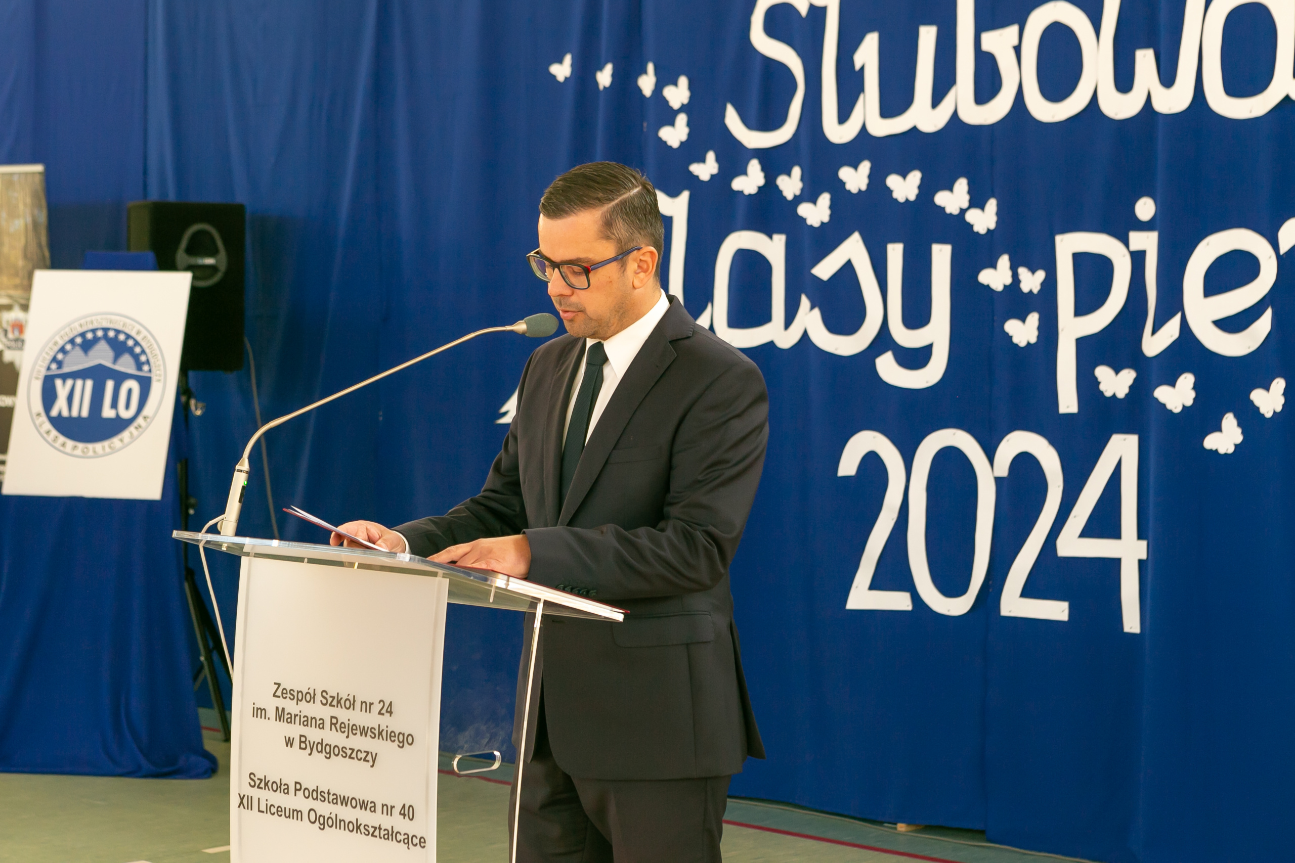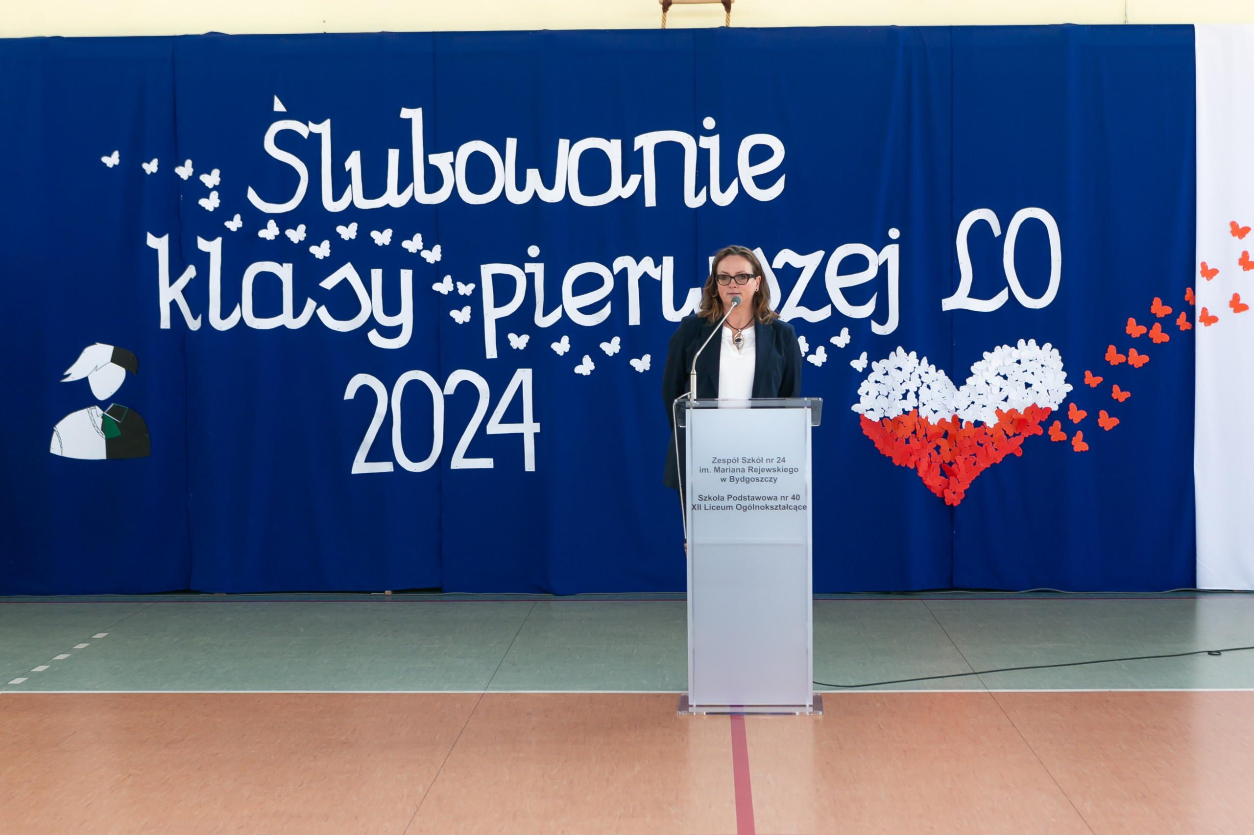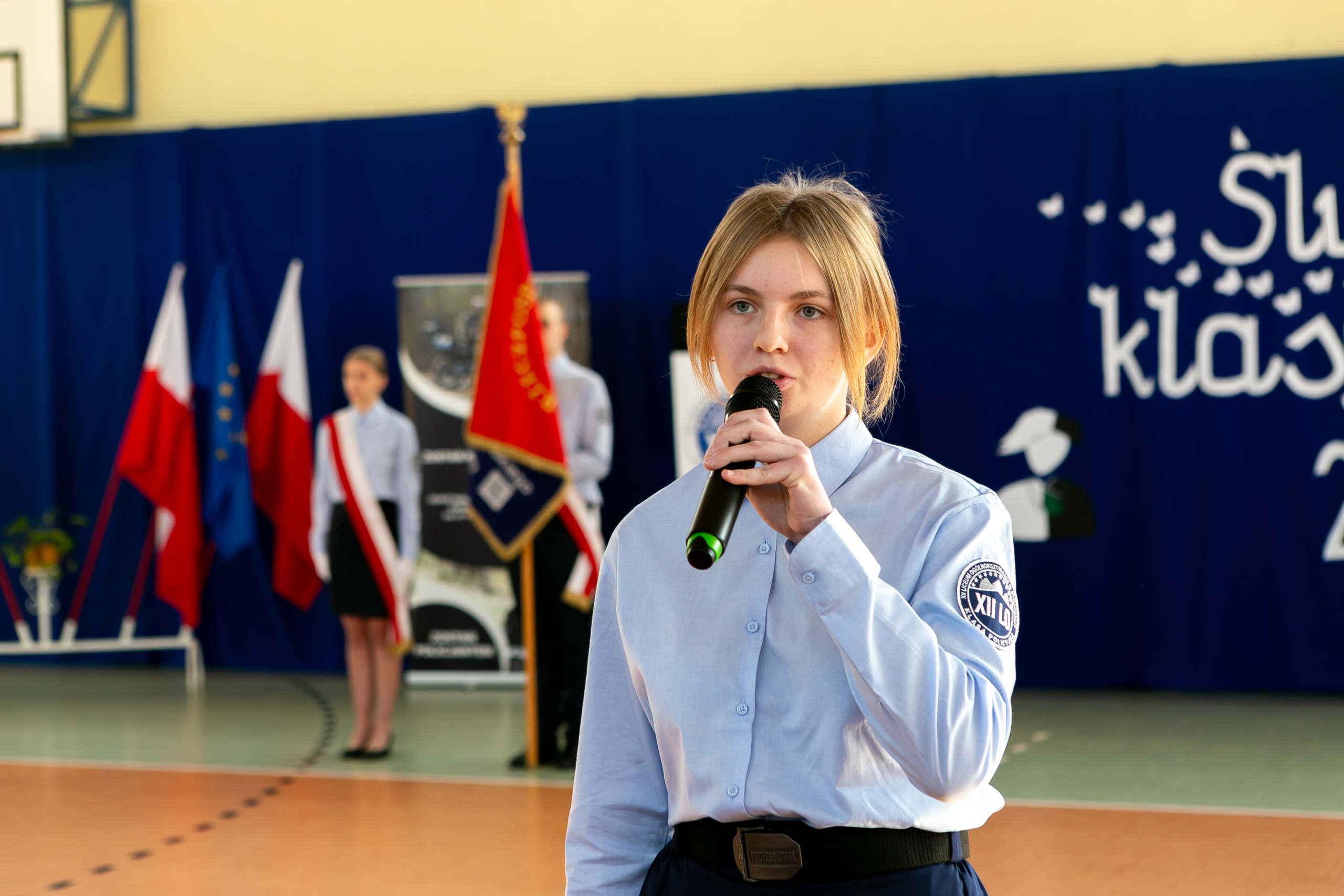Uczestników wydarzenia powitał Dyrektor szkoły mgr inż. Leszek Sobieraj. W swoim wystąpieniu zwrócił uwagę na doniosłość tego dnia w życiu uczniów XII LO, a także na fakt, iż edukacja policyjna i psychologiczno-prawna może stanowić ważny bonus w ich późniejszej karierze zawodowej. Wszyscy przemawiający życzyli pierwszoklasistom, aby nauka w naszym liceum zaowocowała wiedzą i nowymi umiejętnościami, przyniosła im dużo satysfakcji oraz pozostawiła wspaniałe wspomnienia.
