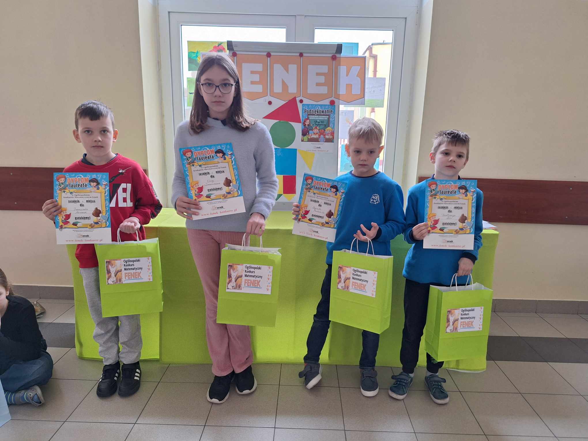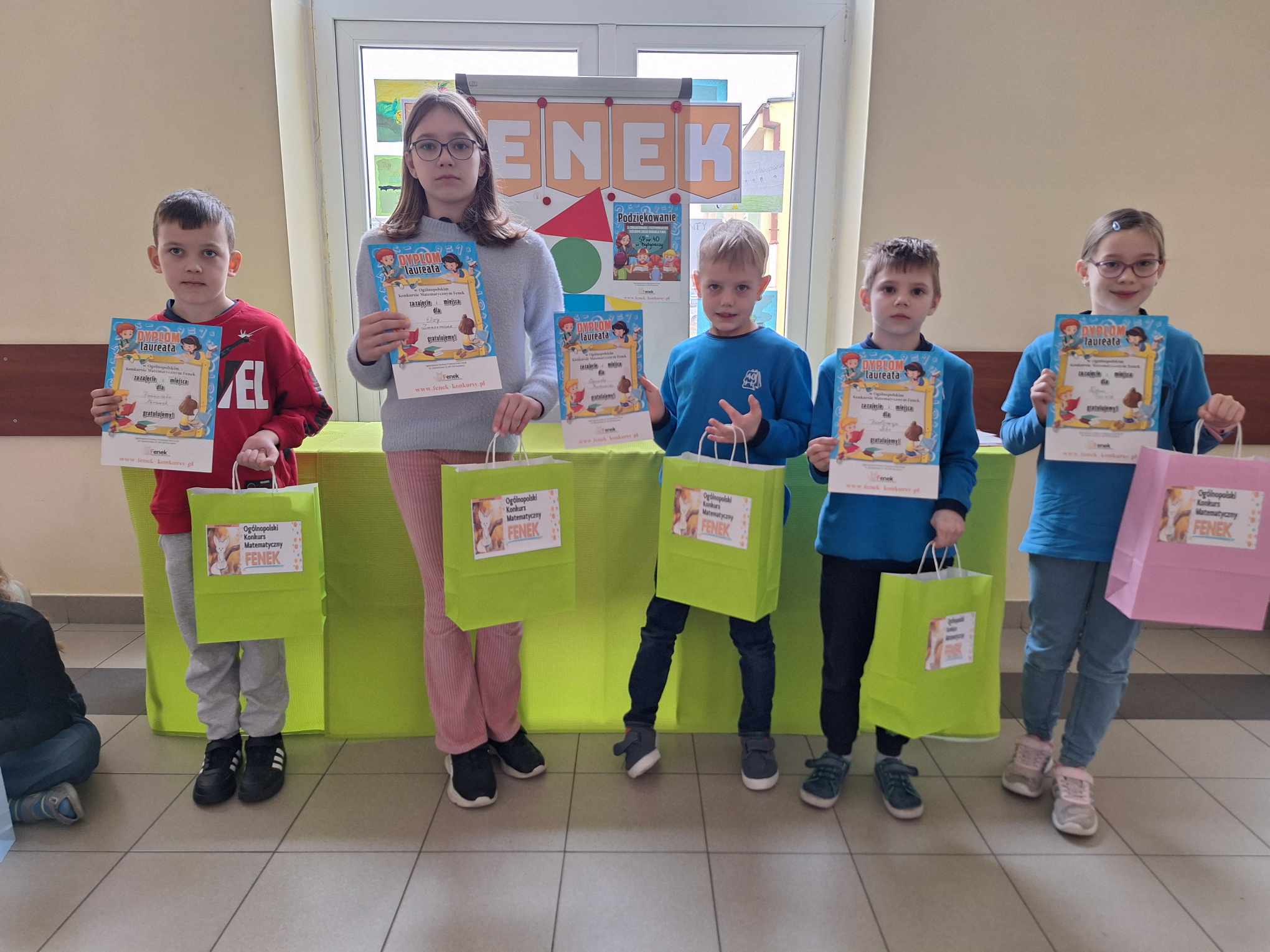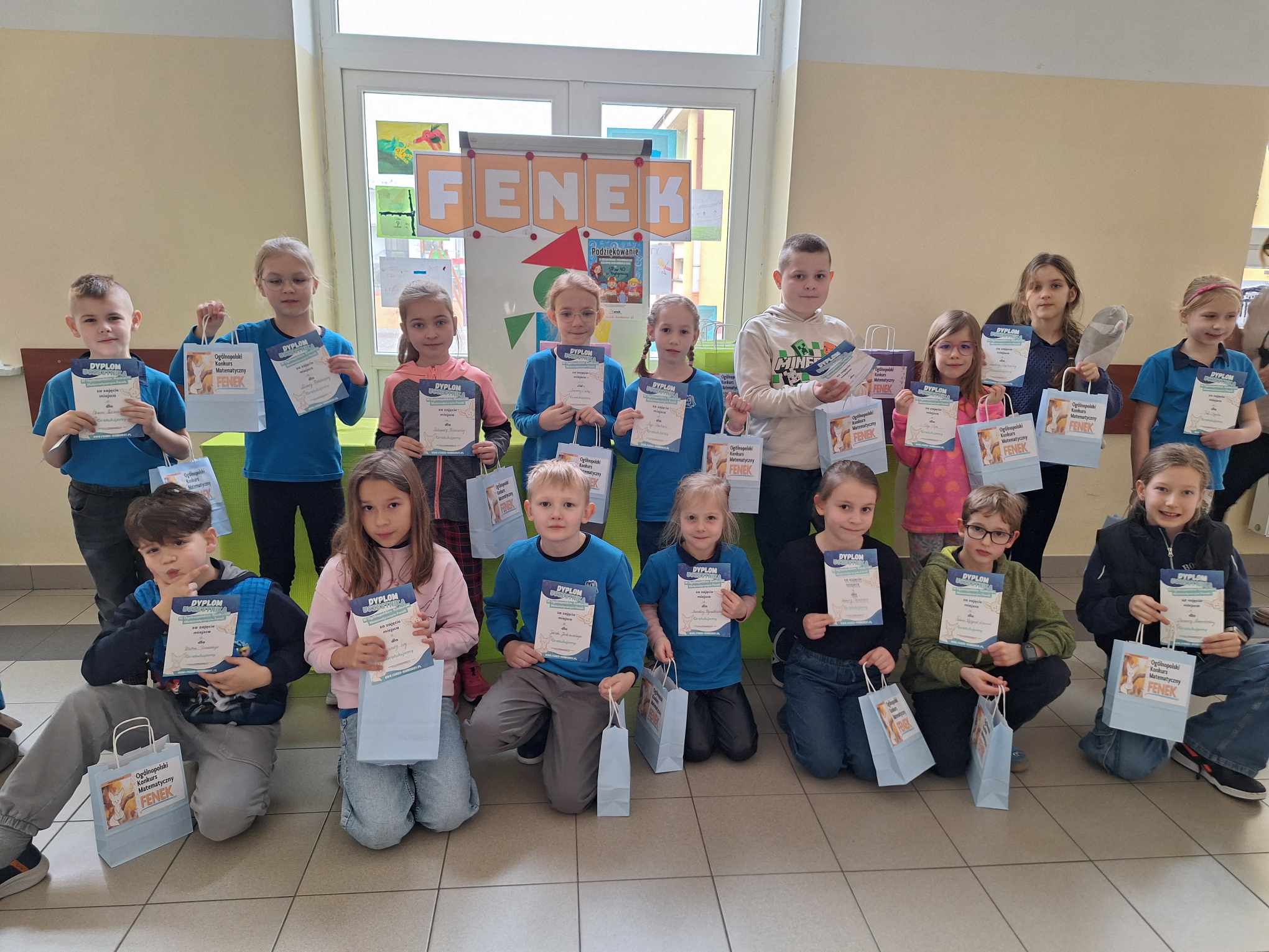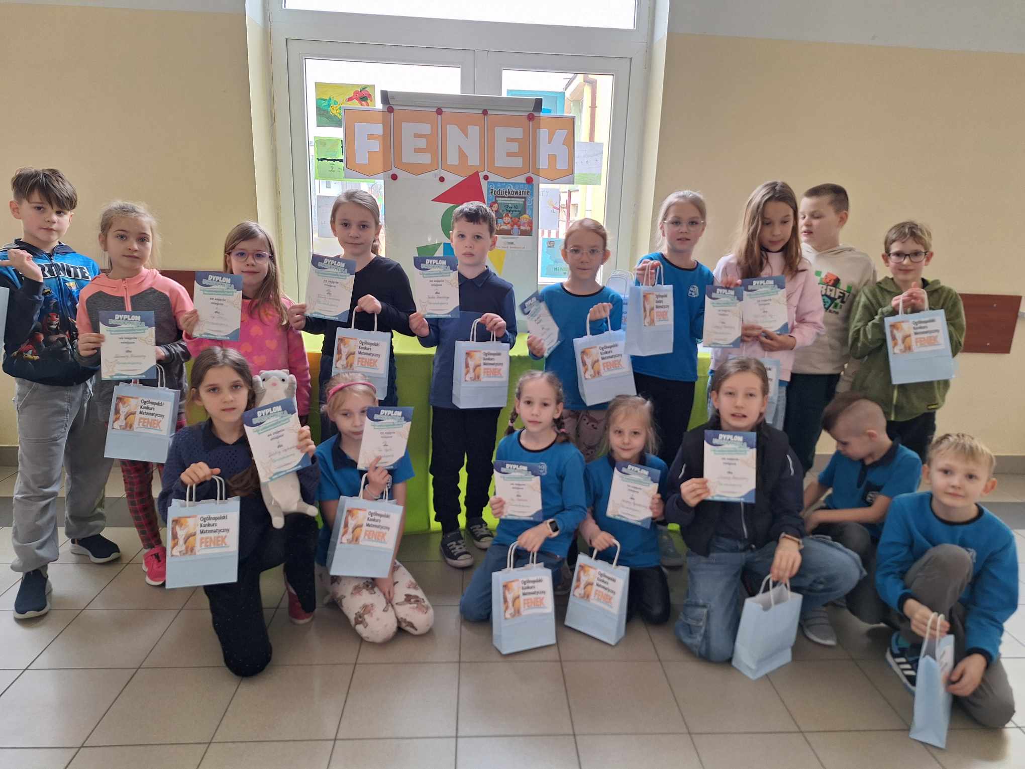 Z ogromną przyjemnością informujemy, że dzisiaj odbyło się uroczyste wręczenie nagród i dyplomów laureatom i uczestnikom Ogólnopolskiego Konkursu Matematycznego FENEK. W konkursie wzięło udział bardzo dużo uczniów z klas 1-3. Uczestnicy rywalizowali w trzech kategoriach wiekowych, rozwiązując zadania o różnym stopniu trudności.