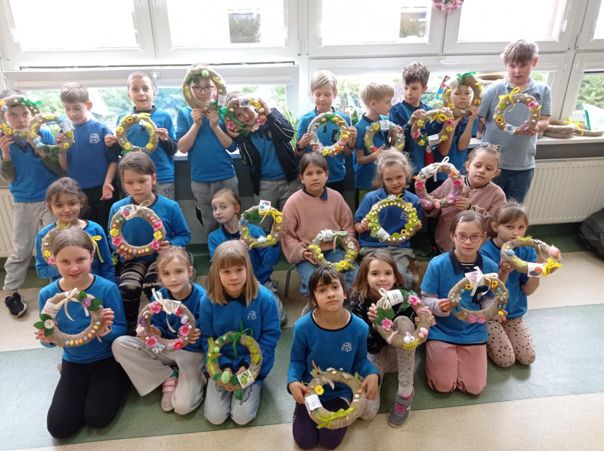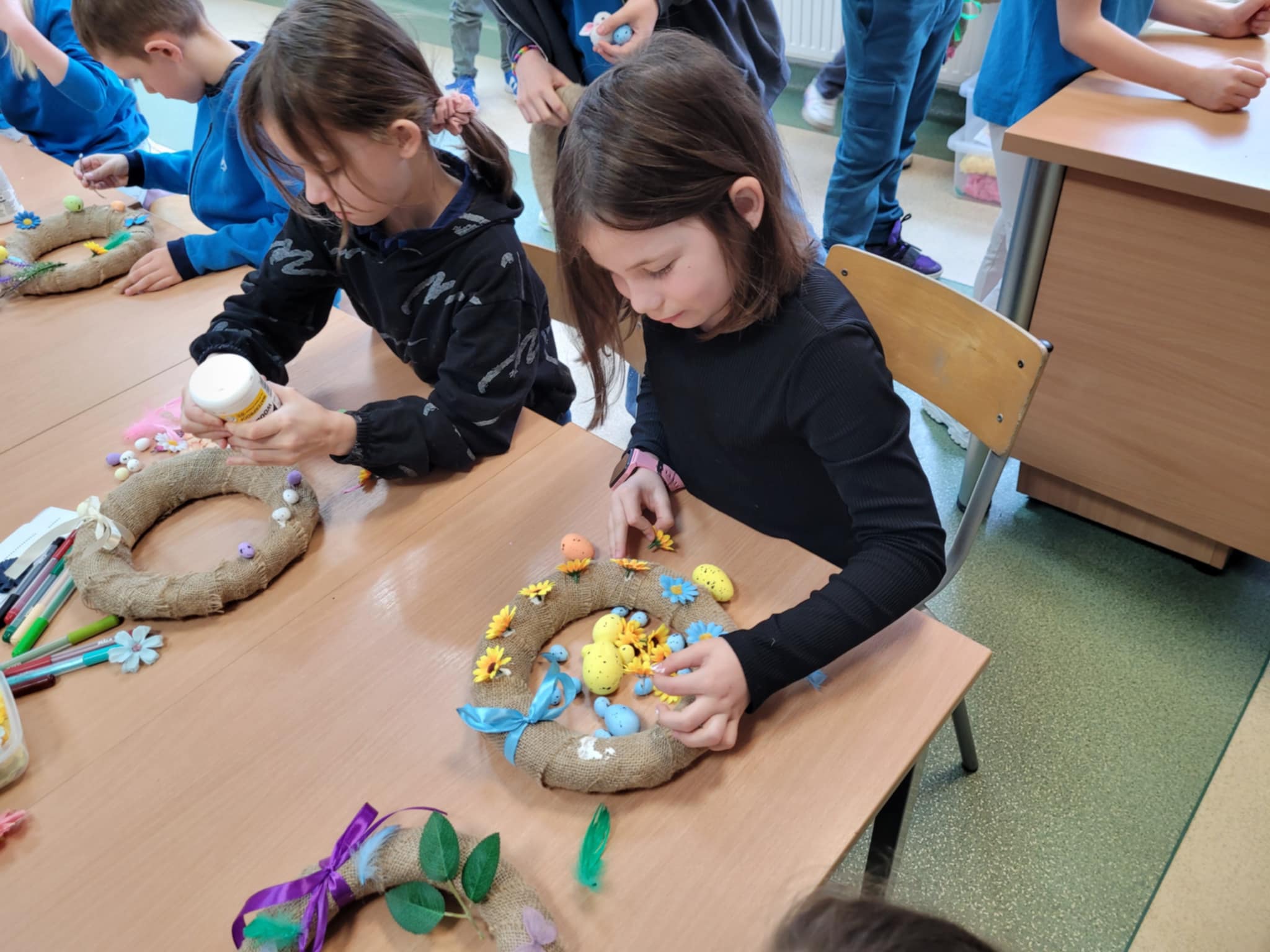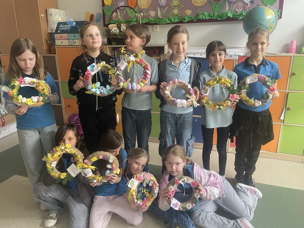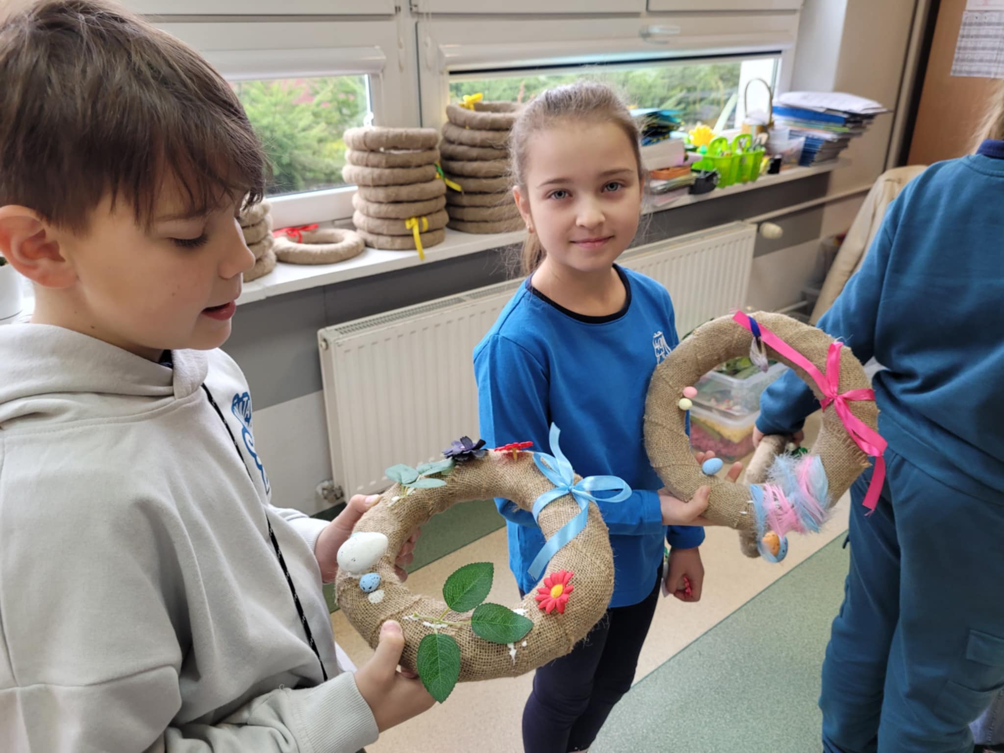 Dzisiejsze warsztaty miały na celu zapoznanie dzieci z klas 0-3 z tradycją tworzenia wianków wielkanocnych. Podczas spotkania uczniowie rozwijali umiejętności manualne poprzez samodzielne dobieranie i ozdabianie rekwizytów wiosny.