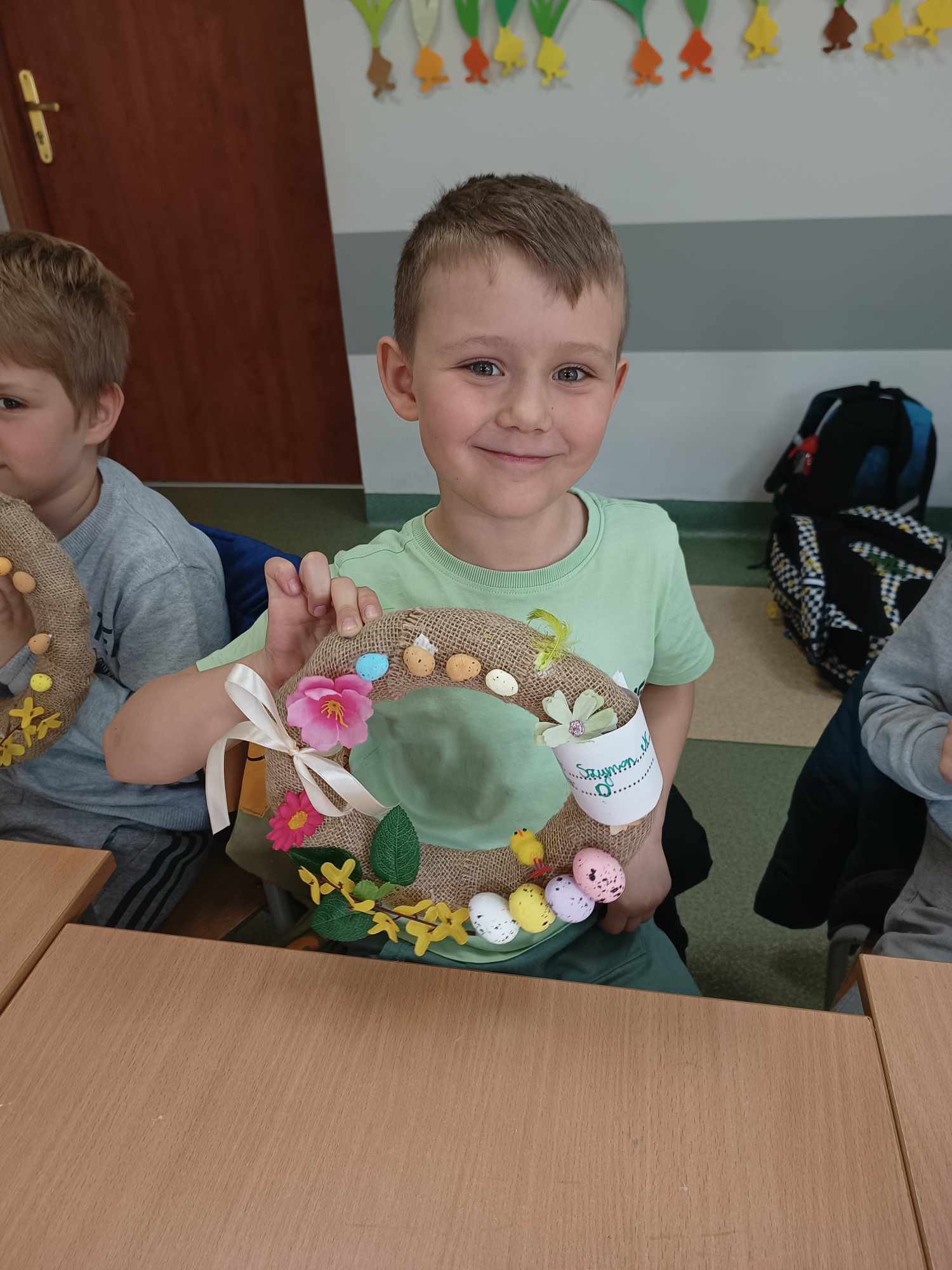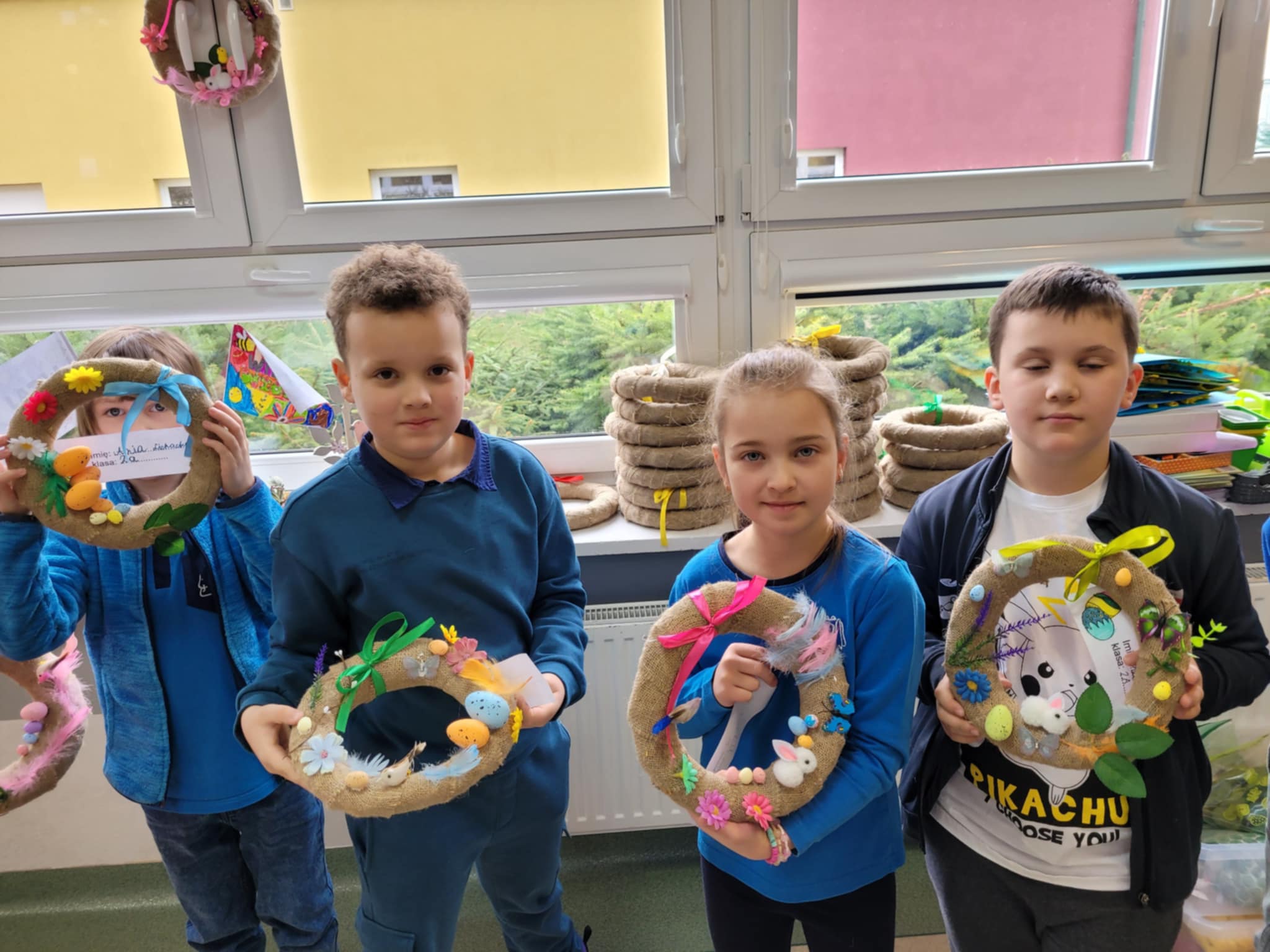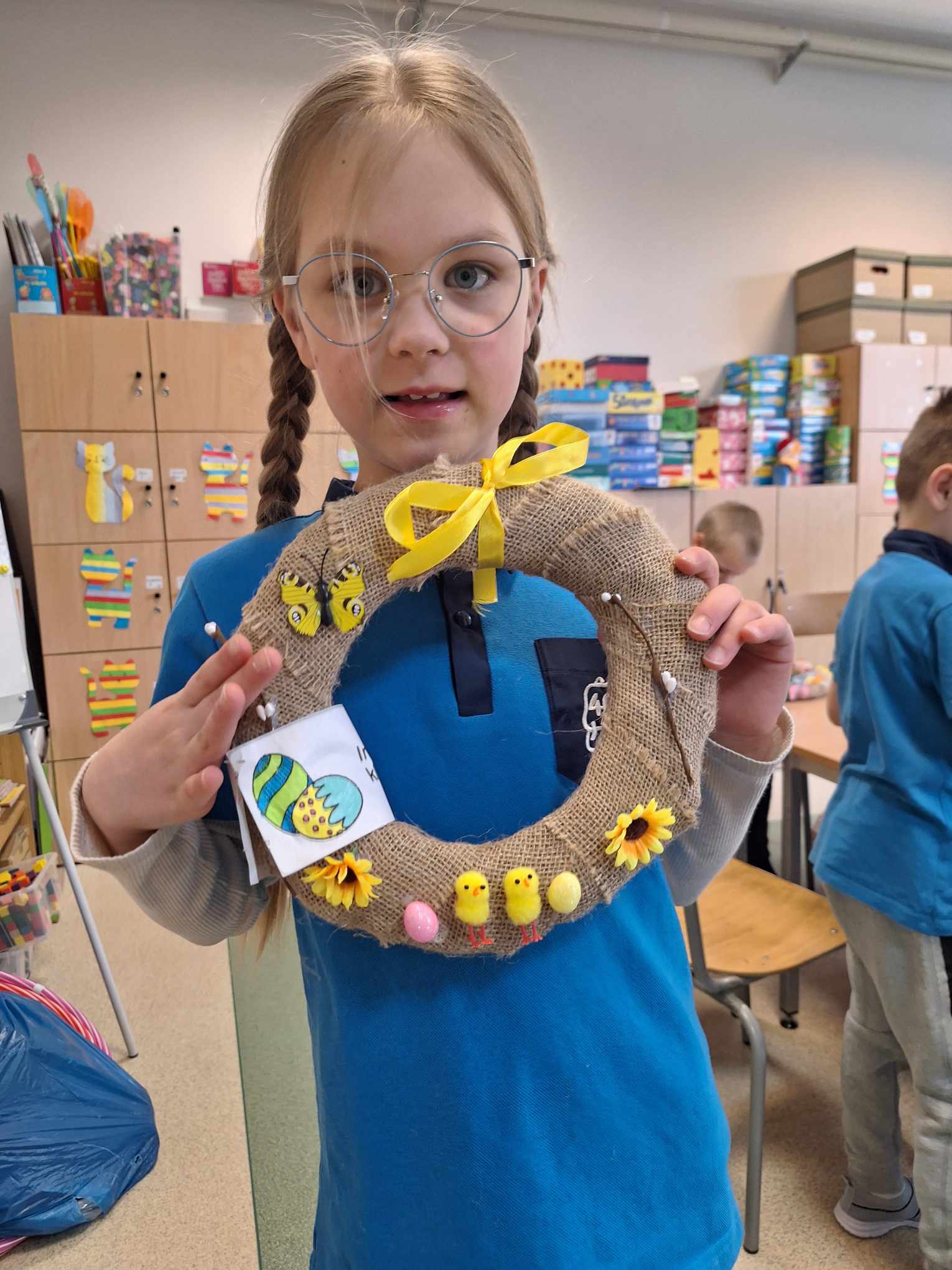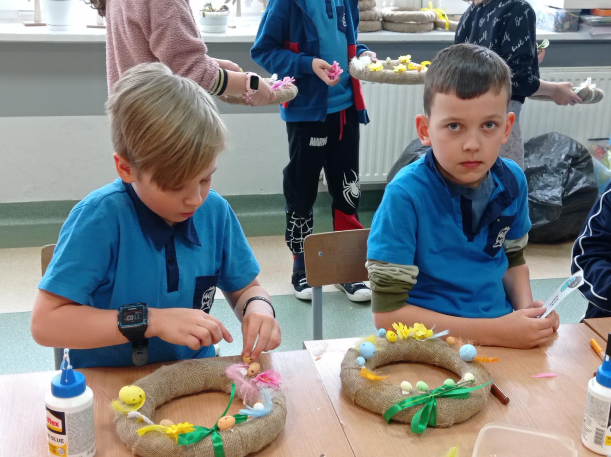 Dzisiejsze warsztaty miały na celu zapoznanie dzieci z klas 0-3 z tradycją tworzenia wianków wielkanocnych. Podczas spotkania uczniowie rozwijali umiejętności manualne poprzez samodzielne dobieranie i ozdabianie rekwizytów wiosny.