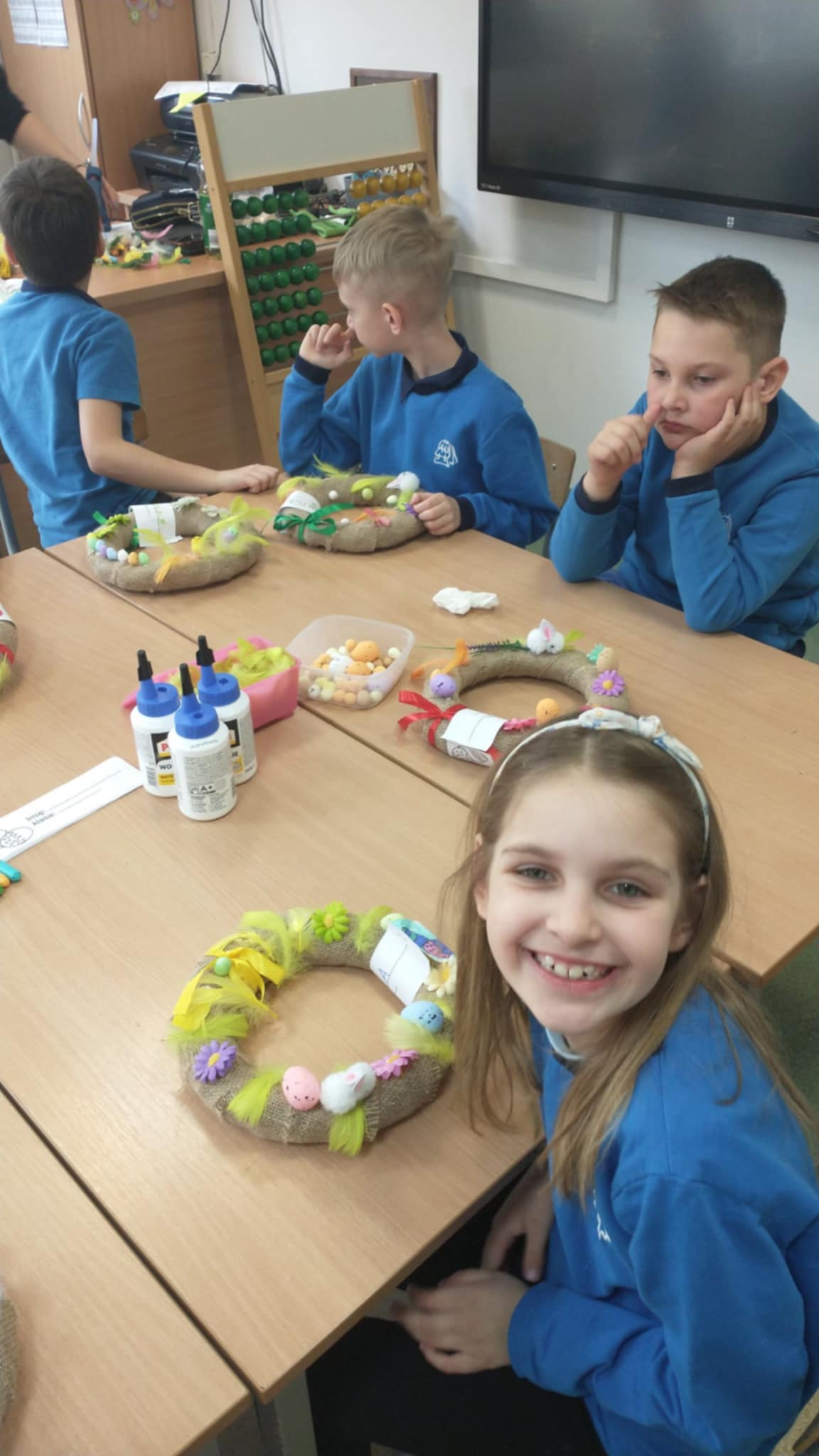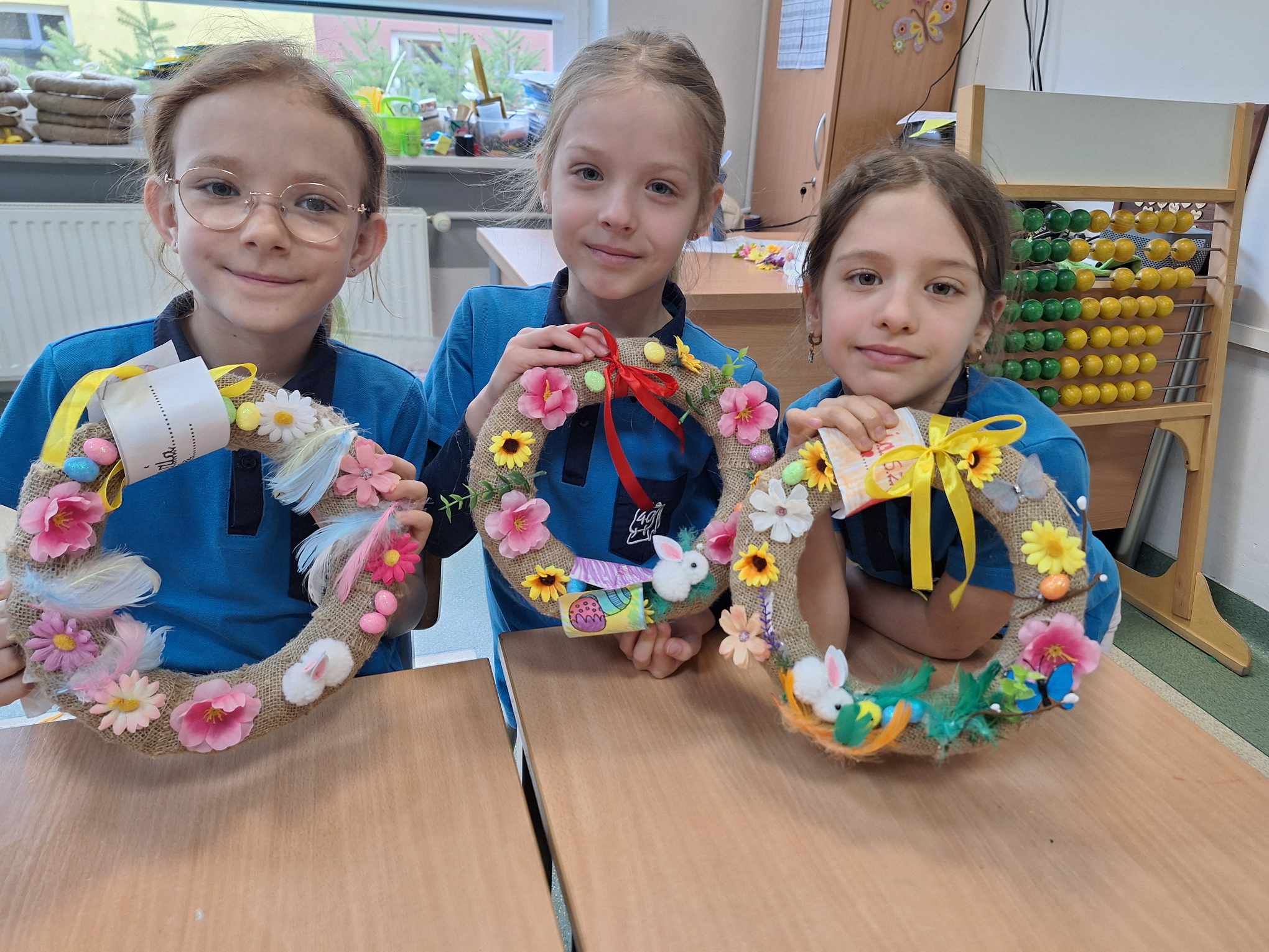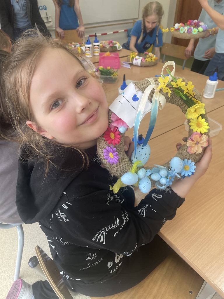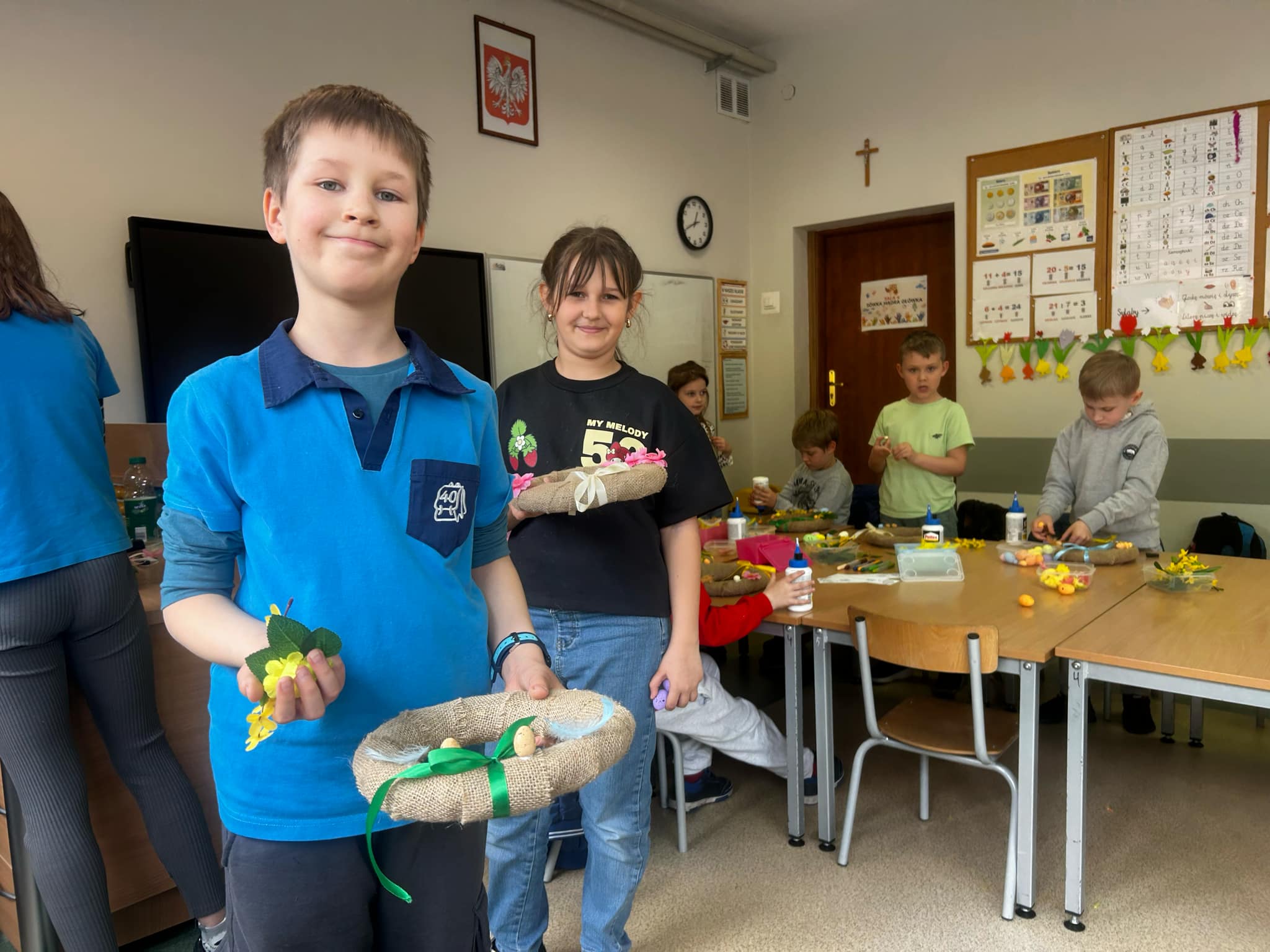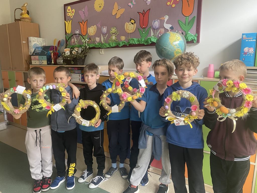 Dzisiejsze warsztaty miały na celu zapoznanie dzieci z klas 0-3 z tradycją tworzenia wianków wielkanocnych. Podczas spotkania uczniowie rozwijali umiejętności manualne poprzez samodzielne dobieranie i ozdabianie rekwizytów wiosny.
