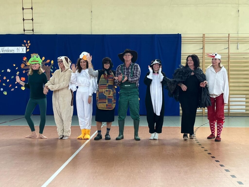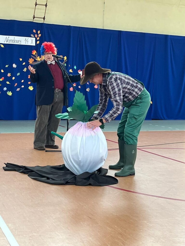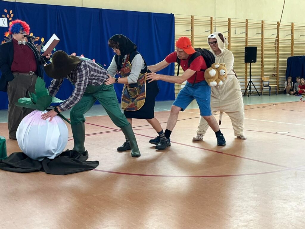 Publiczność obejrzała także inscenizację „Rzepki” w humorystycznym wydaniu, w której w rolach aktorów wystąpili nauczyciele naszej szkoły. Nie zabrakło też tańca z parasolkami i muzycznego występu chóru, który wykonał piosenkę „Wszystkiego najlepszego”.
