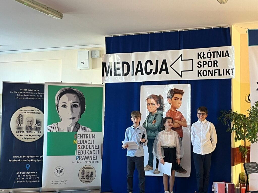 Szkolni mediatorzy rówieśniczy wystąpili w scence mediacyjnej, która miała na celu uświadomić po raz kolejny uczniom naszej szkoły, że każdy konflikt oraz spór mogą zakończyć się powodzeniem. Wystarczy tylko zaufać i poddać się mediacji. Wiedzą na jej temat uczniowie SP40 oraz XIILO mogli się wykazać w przygotowanym dla nich teście.