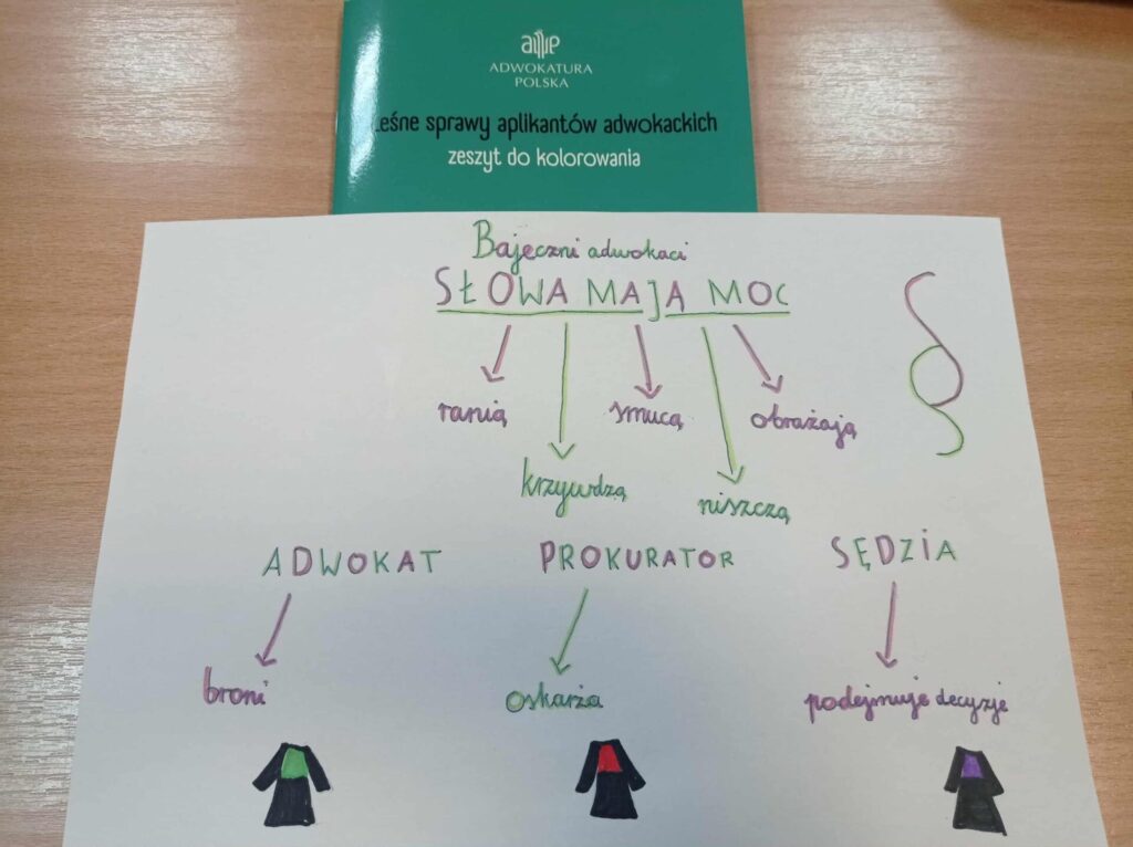 Na zakończenie każdy uczeń otrzymał pamiątkową książeczkę i kolorową zakładkę z bohaterami akcji „Bajeczni Adwokaci”. Upominki wywołały mnóstwo uśmiechów i z pewnością będą miłą pamiątką z dzisiejszego spotkania.